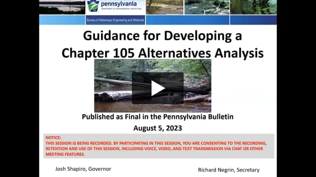 This course is an overview of the DEP's new technical guidance document "Guidance for Developing a Chapter 105 Alternatives Analysis", which is a requirement of the Chapter 105 Environmental Assessment. The course is intended for applicants and consultants. This guidance was published as final in the Pennsylvania Bulletin on Aug 5, 2023 at 53 Pa.B. 4501, and is available for download on PA DEP's eLibrary.